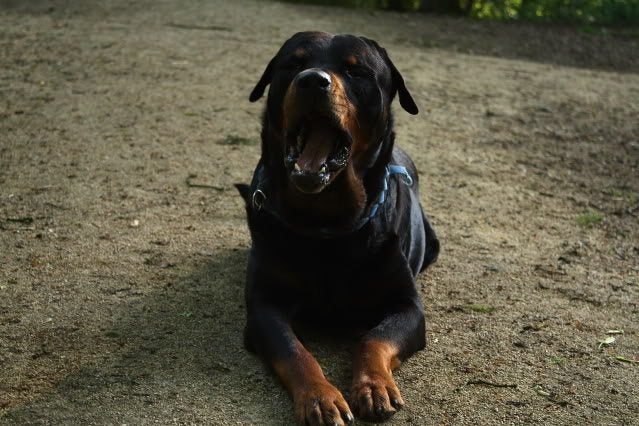 Devel Rottweiler Devel is een Rottweiler reu van mijn schoonouders die is opgehaald met 1,5 jaar. Vandaan gehaald bij mensen die niet wisten hoe groot een Rottweiler zou kunnen uitgroeien. Mensen die zich niet hebben ingelicht over het ras uiteraard. Devel is een Rottweiler met een flink karakter die zich niet zomaar de les laat lezen, maar ondanks dat komt soms zijn zachte aard naar boven en knuffelt hij maar al te graag. Spelletjes is hij niet meer zo van, en helaas is hij sinds een korte tijd blind geworden door de erfelijke aandoening Glaucoom en geniet hij van zijn oude dag. Ondanks dat hij niet fotogeniek is, heb ik een aantal leuke plaatjes van hem kunnen schieten, toen hij nog niet blind was. |